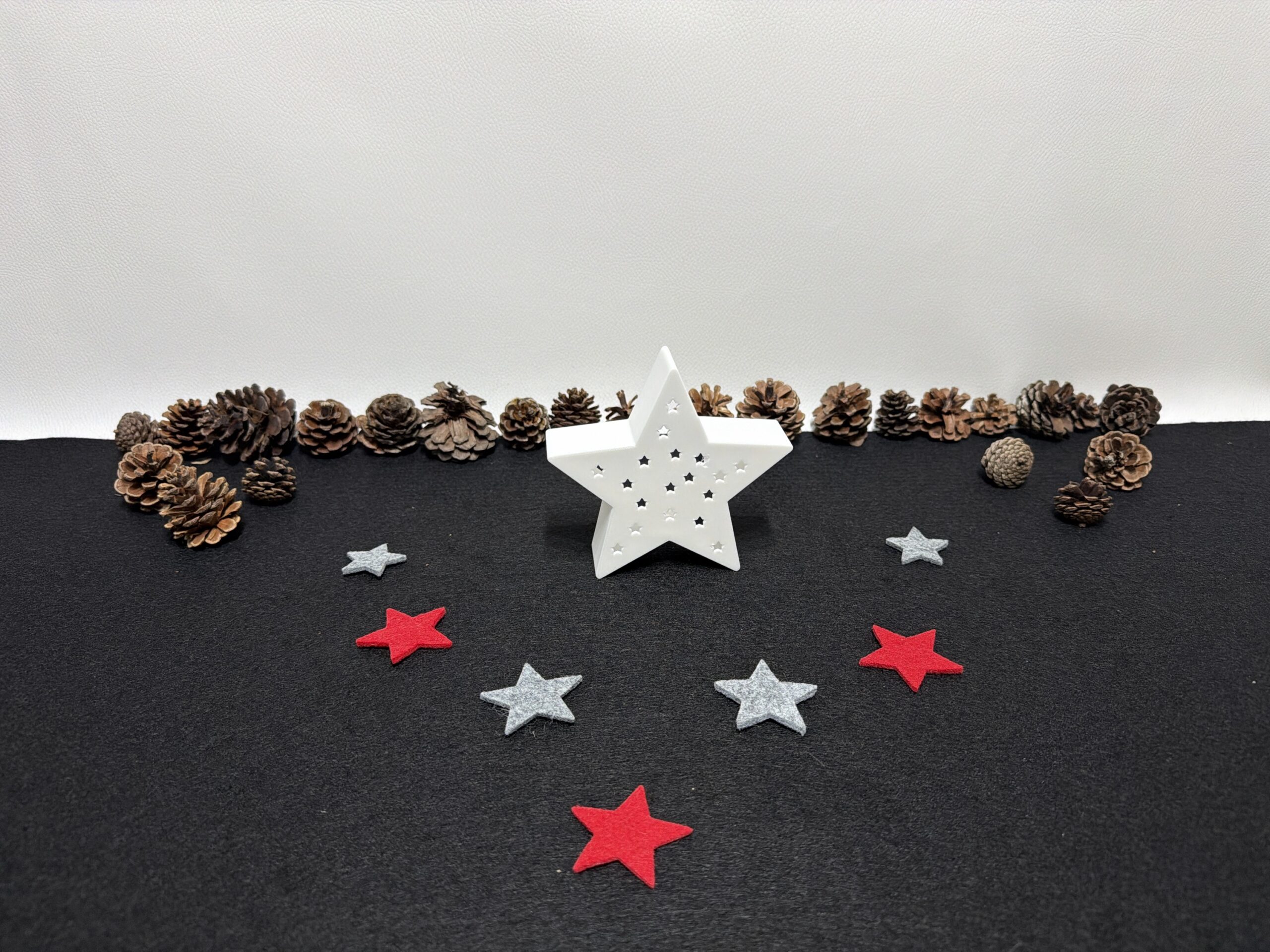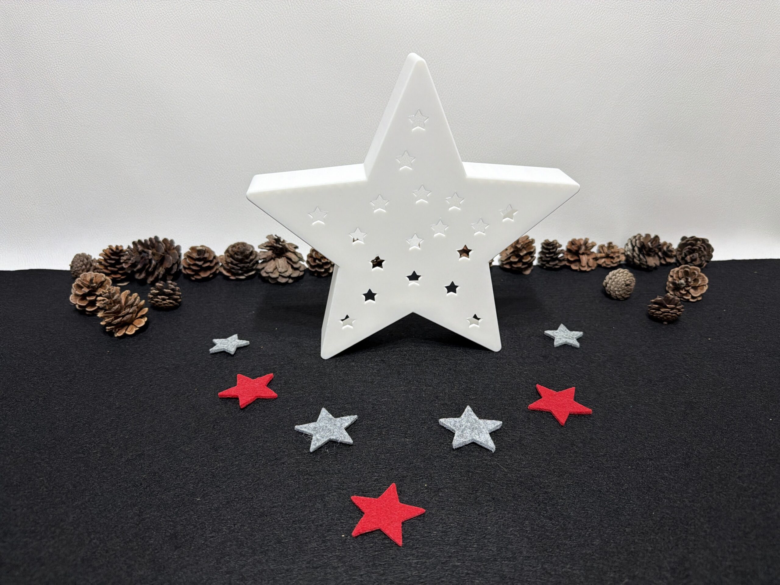 Jeder Stern wird präzise im 3D-Druck gefertigt und besticht durch die fein gearbeiteten Stern-Ausschnitte, die das Licht besonders stimmungsvoll durchscheinen lassen.